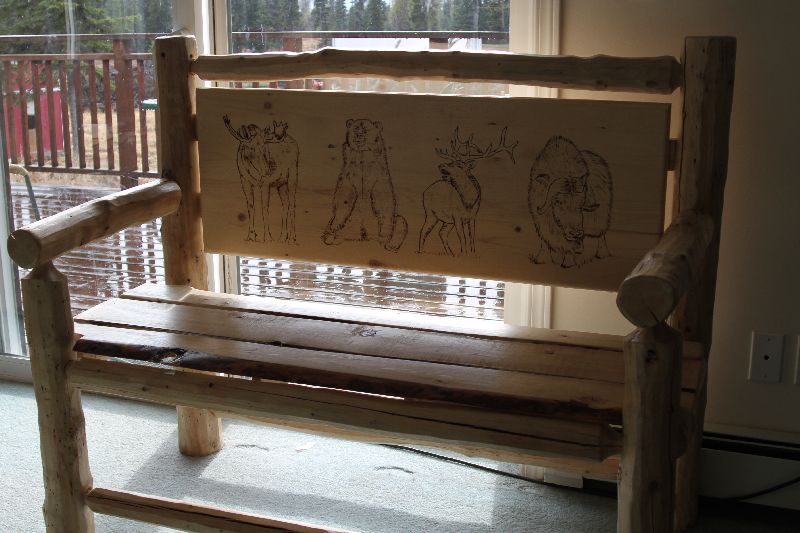 Bored with the tables, I begin to visualize a bench. It had to be something unique, something fun, something Alaskan. Below is some things I came up with. Mind you, same stinkin’ manufactured board for the back, but at least I spiced them up with some woodburning. The next pieces will be completely from scratch…stuff I drag out of the woods, like the logs are. But for now…(there goes that “some day” again.)